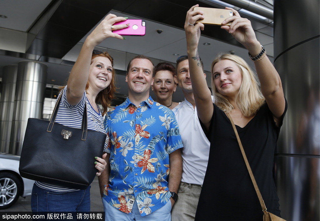 俄总理梅德韦杰夫穿花衬衫与游客合影自拍(高清组图)
