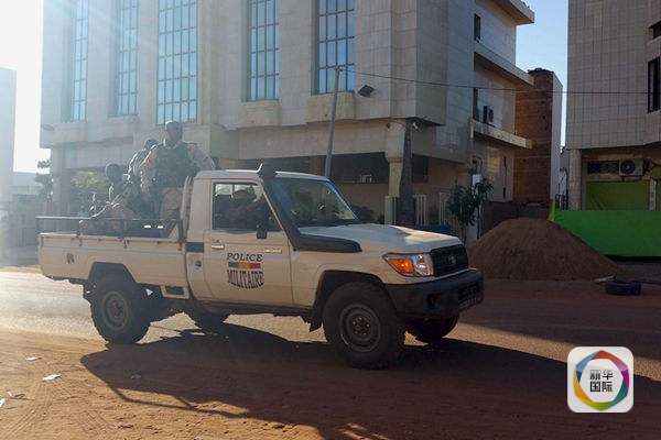 马里安全人员乘车从首都巴马科发生枪战的丽笙酒店外驶过。