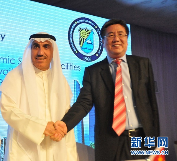 中建中东有限责任公司副总经理兼中建公司驻科威特代表处总经理杨春森(右)和科威特大学校长侯赛因·安萨里(左)在签约后握手。 新华网发