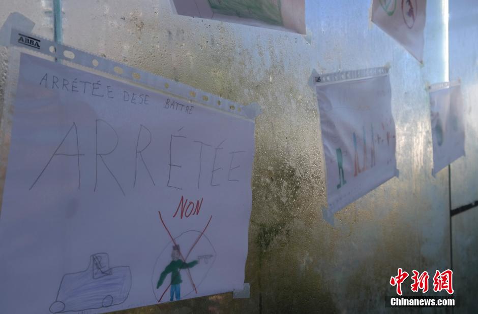 11月23日,星期一,比利时首都布鲁塞尔大区的安全警戒级别继续保持在最高级。当天,布鲁塞尔的地铁、学校、大型商业设施、体育健身设施等全部关闭。图为布鲁塞尔小学生画的画,反对极端恐怖主义行径。中新社记者 沈晨 摄