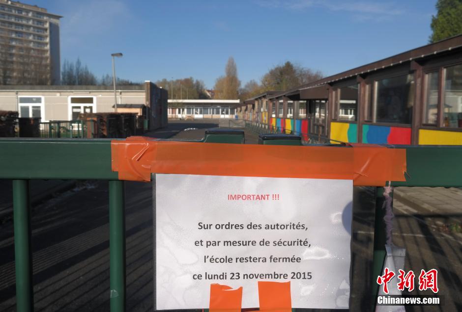 11月23日,星期一,比利时首都布鲁塞尔大区的安全警戒级别继续保持在最高级。当天,布鲁塞尔的地铁、学校、大型商业设施、体育健身设施等全部关闭。图为关闭的学校。中新社记者 沈晨 摄