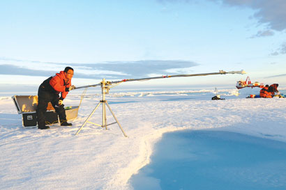 我国北极科考队员正在观测由气候变暖导致的冰面变化情况。(中国极地研究中心供图)