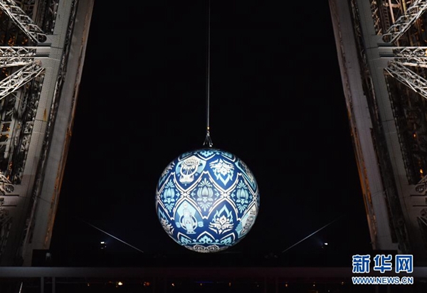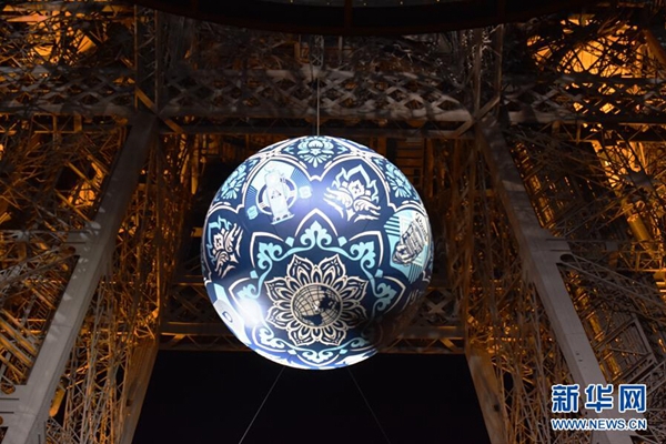11月23日,在法国巴黎,一个名为“地球危机”的大圆球悬挂在埃菲尔铁塔上。