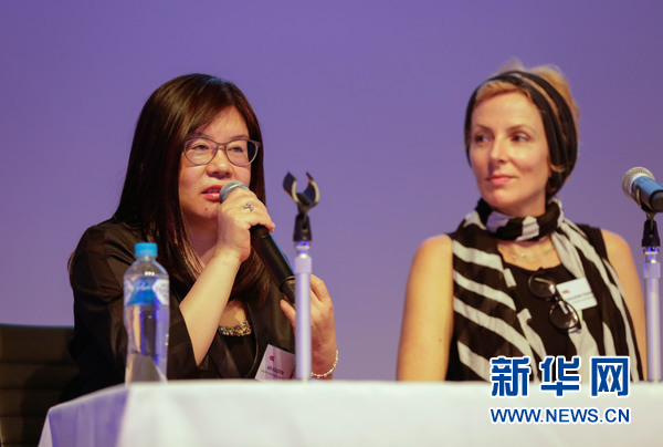 图为中国电影业界知名制片人及大盛国际传媒总裁安晓芬与现场电影人做经验交流。新华社发