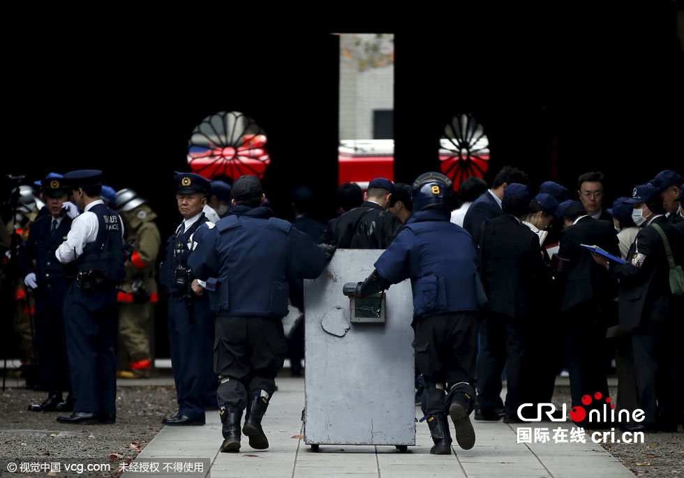 当地时间2015年11月23日,日本东京,靖国神社南门一处公共洗手间发生爆炸。当地警方怀疑此次事件是有意针对靖国神社实施的恶意袭击,目前正在就此展开调查。警察和官员在爆炸地附近。图片来源:Reuters/视觉中国