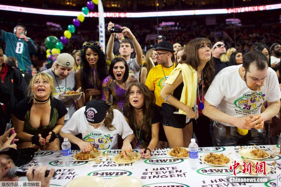 当地时间2015年1月30日,美国费城,当地举办一年一度的吃鸡翅大赛,一群“最佳吃货”展开激烈角逐。冠军由一位来自芝加哥的参赛选手,他在20分钟内吃掉了444只鸡翅,同时打破了以往比赛的记录。