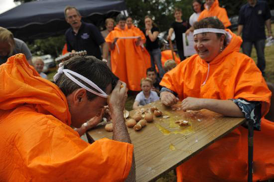 2008年6月29日,英国林肯郡,参加年度世界扔鸡蛋比赛的选手,选手正在参加一项名叫俄罗斯鸡蛋轮盘赌的项目,规则是每名选手面前有6个鸡蛋,其中只有1个是生的,选手们1对1的比赛,需要用脑门砸开鸡蛋,找出那个生鸡蛋。
