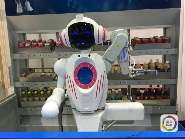 最后,博览会上还有许多与我们日常生活相关的服务性机器人。比如上图中这种售货机器人,能够根据顾客的指令从货架上取出一瓶饮料,再交给顾客。