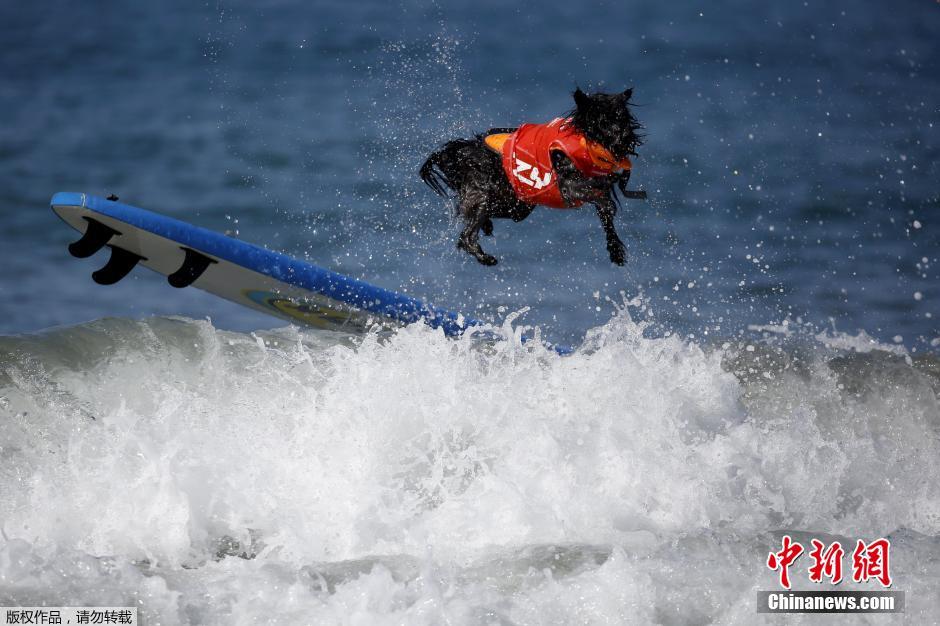 当地时间9月27日,在美国加州亨廷顿海滩举行的狗狗冲浪大赛上,一只参赛小狗在海浪中飞起来。