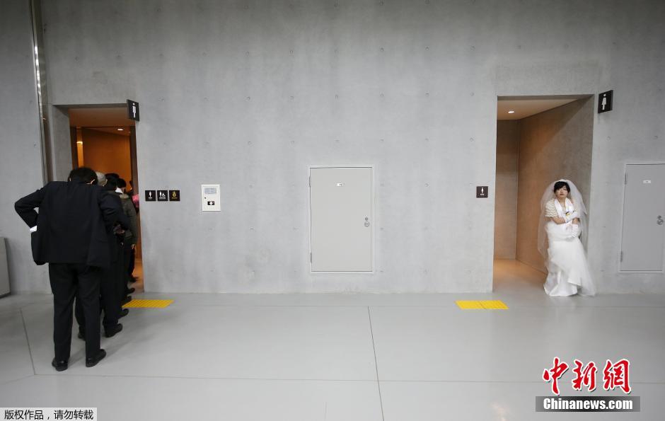 3月3日,韩国加平郡,在一场集体婚礼的间隙,一名新娘在女厕门口,旁边男厕则有众多新郎在排队。