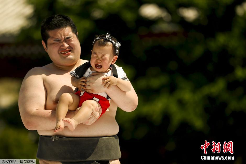 5月30日,日本东京,一年一度的婴儿啼哭大赛在东京浅草寺举行,第一个让婴儿哭泣并且哭声最响亮的的选手赢得比赛。一名相扑手努力使婴儿哭泣的同时,自己也很为难。
