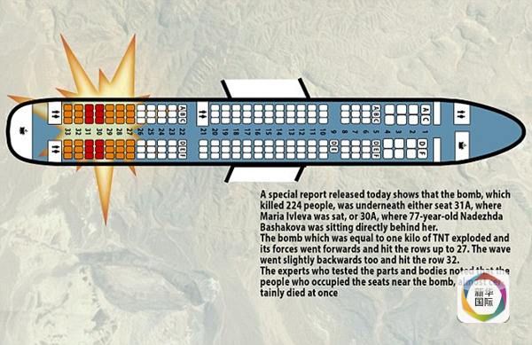 据俄罗斯生活新闻网站报道,调查人员根据化学痕迹等线索测定,炸弹放置位置可能是30A或31A座位下方。