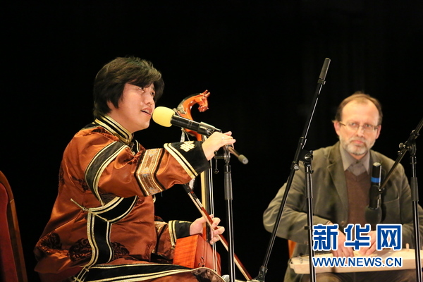 2015年11月24日,在立陶宛维尔纽斯,蒙古族歌手蒙根在音乐会上表演马头琴、呼麦等。当日,立陶宛维尔纽斯大学孔子学院举办“草原之歌”音乐会,来自内蒙古的蒙古族歌手为立陶宛观众带来了长调、呼麦、马头琴等原生态的音乐和舞蹈表演。演出获得立陶宛各界一致好评。新华社记者卜鹏摄