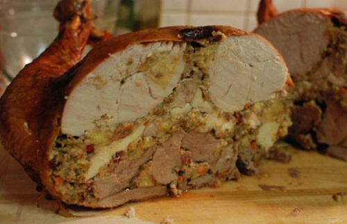 顾名思义,“火鸭鸡”是火鸡(turkey)、鸭子(duck)和鸡(chicken)的组合,其做法是将鸡填到鸭子肚子里,然后再将填了鸡的鸭子填到火鸡肚子里。