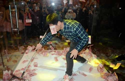 2015年1月29日,上海,“第九城市”年会举行。现场发放员工福利,送出现金大奖,并别出心裁的在一个透明棚内放上数万元现金,随后由美女礼仪小姐全部撒开。抽到奖的幸运员工,直接进入透明棚内,在规定的时间内用网捞钱,捞到多少就算该员工的现金奖。幸运女员工甚至直接用手捡钱,随后抱着满满一怀的人民币,笑得都合不拢嘴了。