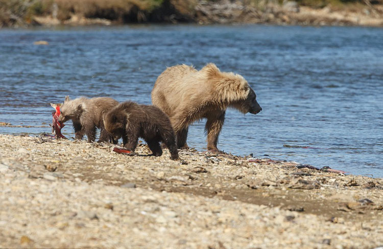 美七月大棕熊幼崽跟着妈妈学捕鱼