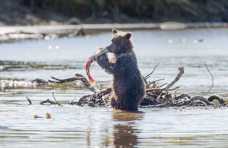 照片中,在卡特迈国家公园,两只棕熊幼崽跟着妈妈学习捕鱼。他们看过妈妈捕鱼后,很快就掌握技巧,轻松捉到鲑鱼。