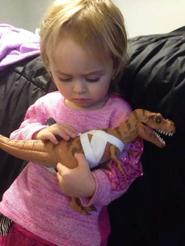“这些身上有伤痕的侏罗纪公园恐龙发售的时候,很多人抱怨这些玩具对于小孩来说太暴力,但我两岁的女儿却想要治疗它们身上的伤,还抱着安慰它。”