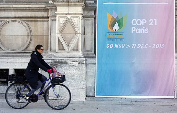 2015年11月26日,一名女子骑车经过法国巴黎街头的气候变化大会宣传展板。(图片来源:路透社)