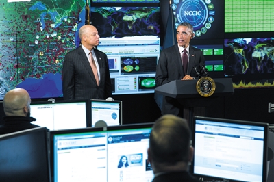 2015年1月13日,美国阿灵顿,奥巴马考察网络安全和通信集成中心期间表示,网络威胁是最严峻的安全挑战之一。