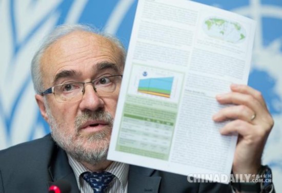 11月9日,世界气象组织秘书长米歇尔·雅罗在瑞士日内瓦出席记者会时展示《温室气体公报》。世界气象组织当日发布最新报告称,2014年大气中温室气体浓度再创新纪录,并且在持续不断地上升,加剧气候变化。这份名为《温室气体公报》的报告是世界气象组织自2004年起每年在联合国气候谈判前发布的年度报告。(新华社记者 徐金泉 摄)