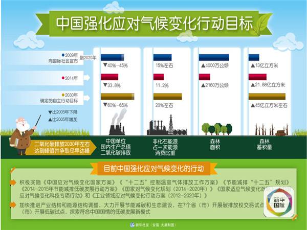 今年6月,中国正式向联合国提交2020年后应对气候变化的“国家自主决定贡献”:二氧化碳排放2030年左右达到峰值并争取尽早实现,单位国内生产总值二氧化碳排放比2005年下降60%至65%,非化石能源占一次能源消费比重达到20%左右,森林蓄积量比2005年增加45亿立方米左右。