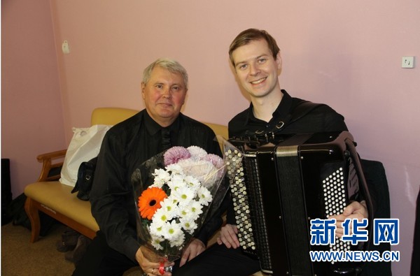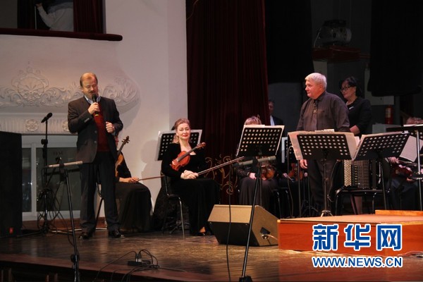 28日俄罗斯功勋演员瓦列莉亚·谢尔盖耶夫娜及其学生在俄远东地区符拉迪沃斯托克市滨海音乐厅举行交响乐表演。新华社记者吴刚摄