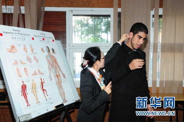 中国援摩洛哥医疗队中医大夫崔花顺与摩洛哥大学生探讨中医的头部穴位问题。11月28日,摩洛哥穆罕默德五世大学孔子学院举行了一堂别开生面的中医文化课,来自中国援摩医疗队的中医大夫为摩洛哥大学生简明扼要地讲解了中医原理,并为他们演示了中医诊治。摩洛哥大学生们兴趣盎然,与中国医疗队员热情互动探讨中医文化,主动尝试中医治疗。新华社记者 蔡施浩摄