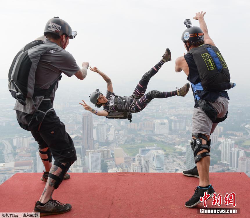 当地时间9月27日,马来西亚吉隆坡,2014吉隆坡塔国际跳伞节举行,来自世界20个国家的大约100名专业定点跳伞选手参加此次活动。选手们从300米高的马来西亚地标建筑吉隆坡塔跳下。