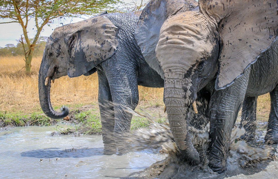 非洲幼象扎进泥坑躲酷热 互喷泥水嬉戏(高清组图)