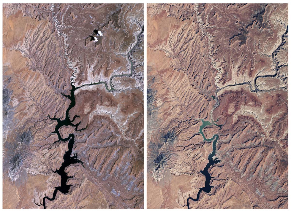 美国宇航局于1991年(左)和2015年(右)拍摄的鲍威尔湖卫星图片。(网页截图)