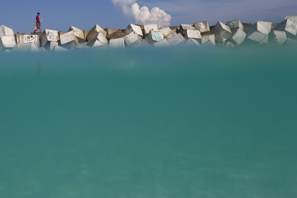 8月14日,这名男子走在坎昆用于防护飓风和羊栖菜海藻的混凝土块上。红树林藻泽曾是防护飓风的天然屏障,却因人类建造酒店等设施被清除。红树林的减少导致海岸被侵蚀,飓风来袭时造成更大危险。(网页截图)