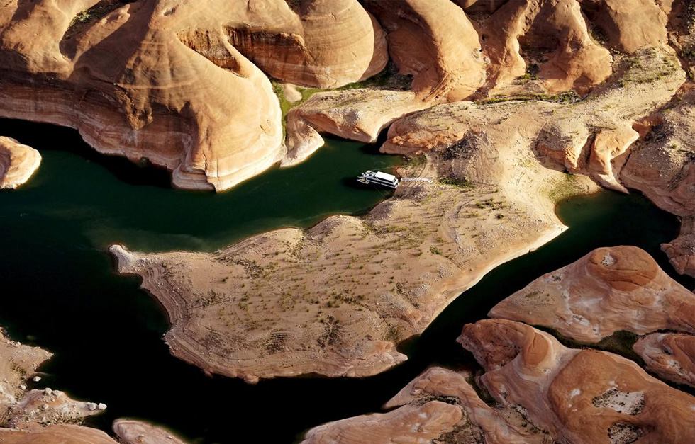 科罗拉多河的鲍威尔湖为内华达州、亚利桑那州以及加州提供水源。但由于近年来严重干旱,这里的水位已经降低58%。5月26日,亚利桑那州佩奇附近的湖面,一艘小船正停靠在浅水中。(网页截图)