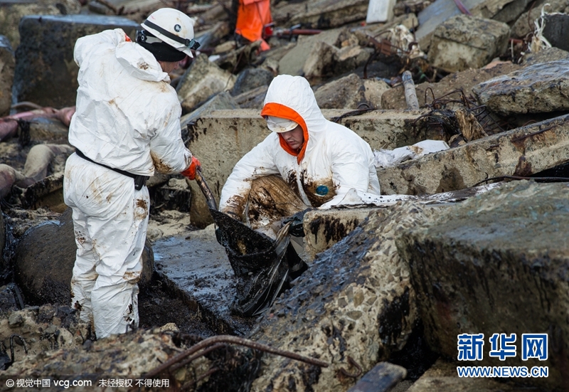 当地时间2015年11月28日,俄罗斯库页岛,一艘载着786吨的燃油和柴油的油轮在库页岛港口城市涅韦尔斯克(Nevelsk)外海搁浅。据悉,油轮因遇到风暴而撞上礁石搁浅,其中一个燃料缸受到损害导致燃油外泄。