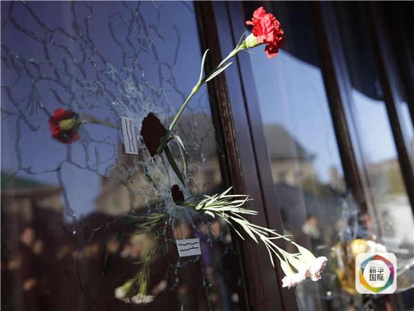 图为11月15日,在法国首都巴黎一处遭恐怖袭击的酒吧,窗玻璃上的弹孔被插上悼念的鲜花。(新华/法新)