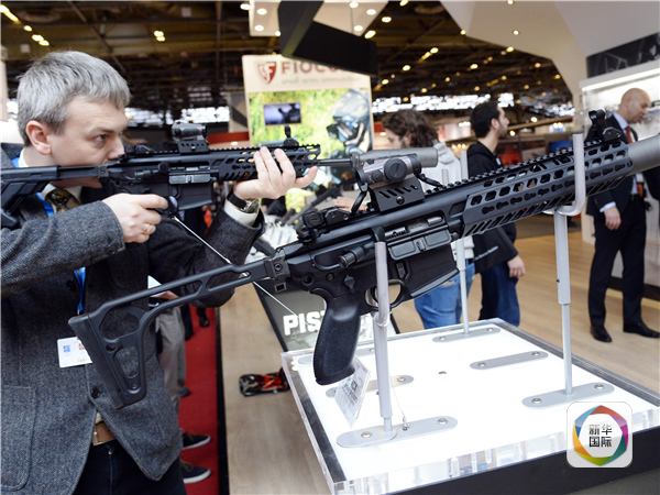 图为11月17日,一名男子在巴黎郊区举行的安全展览上试验一把步枪。(新华/法新)