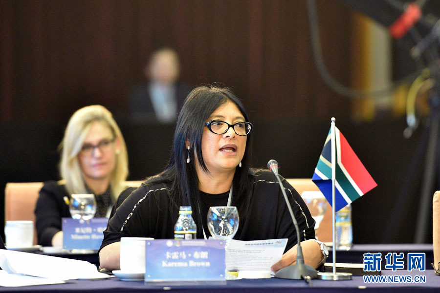 12月1日,首届金砖国家媒体峰会在京召开。图为首届金砖国家媒体峰会共同主席、南非独立传媒集团布朗女士发表演讲。新华网 郭小天 摄