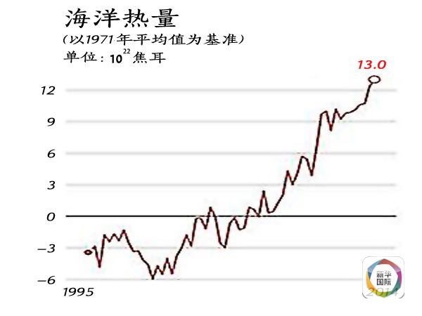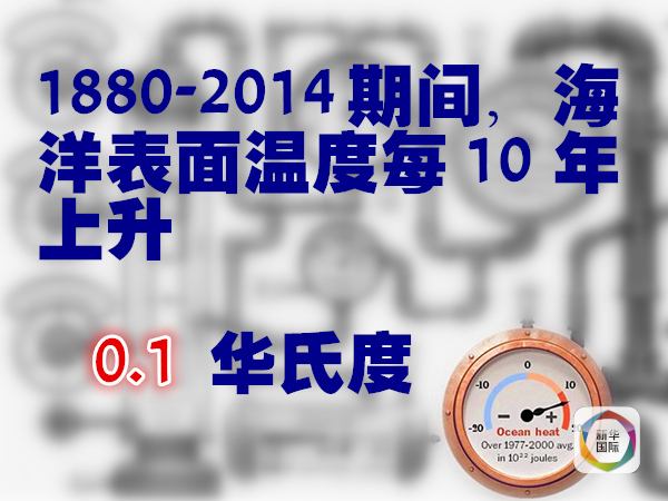 据美国独立机构气候总站统计,从1880年到2014年,海洋表面温度每10年平均升高0.1华氏度。如果按照海洋储存热量的变化来看,以10的22次方焦耳为单位、1971年为基准,1955年海洋储存热量在负3个单位以下,2014年则超过13个单位。