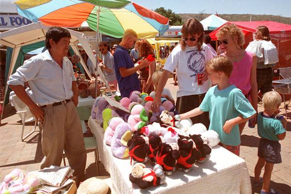 图为1997年北京商人在布鲁马跳蚤市场上出售中国玩具。(新华社记者李晓果摄)