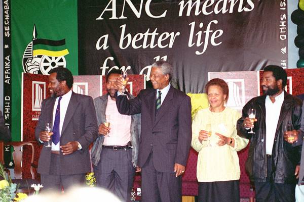 1994年5月2日,曼德拉和他的战友们在约翰内斯堡的卡尔顿饭店大厅庆祝当选总统。(新华社发)
