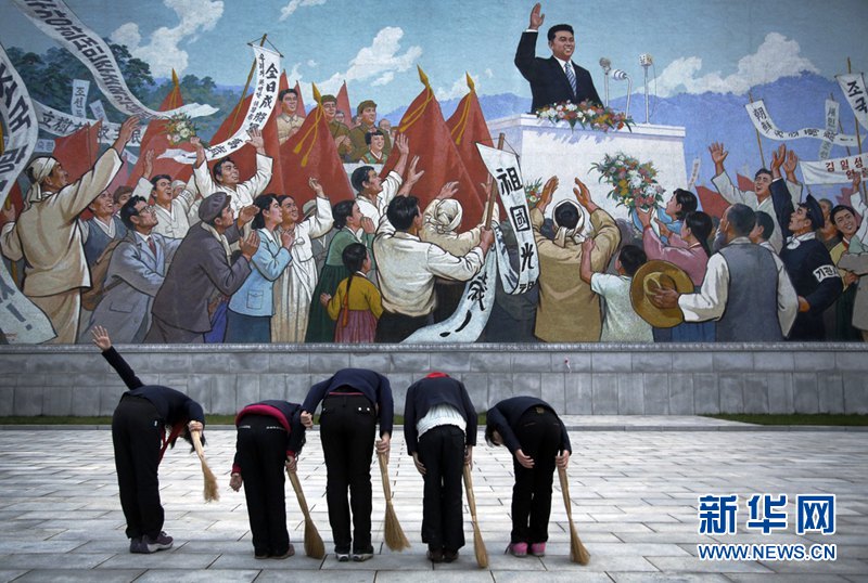 当地时间2015年12月1日,朝鲜平壤,朝鲜女学生拿着扫帚在金日成发表演说的壁画前鞠躬。图片来源:东方IC