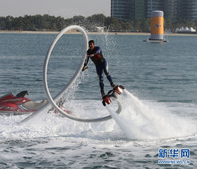 在阿联酋首都阿布扎比海滨拍摄到的喷水飞行器特技表演。喷水飞行器堪称终极水上玩具。这个喷水飞行器可以将人带到近10米的空中,在水上上升到10米再下来是件很刺激的事情,它不光能升空还能潜水,大约能潜入水下3米左右,动力来自一艘摩托艇,后面有一条10多米的长管子供水,水力喷射的力度由站在飞行器上的人通过手中的一个有线遥控器来控制。操控这个飞行器不是一件容易的事,它要求操控人员身体素质很好,并具有较强的平衡能力,因此需经过专业训练才能实现。新华社记者 安江 摄