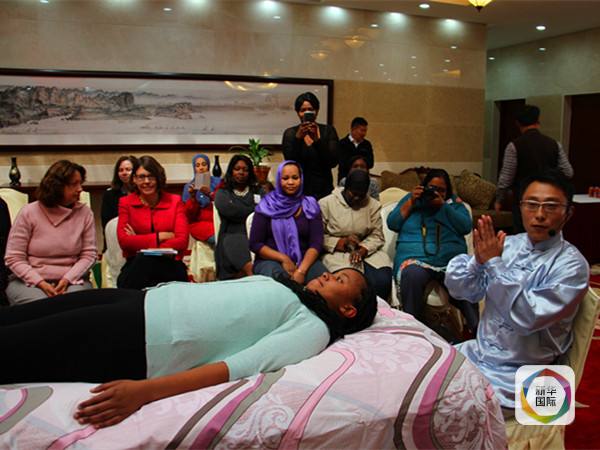 图为中国援纳米比亚医疗队成员王鹏(前右)演示按摩手法。(新华社记者吴长伟摄)