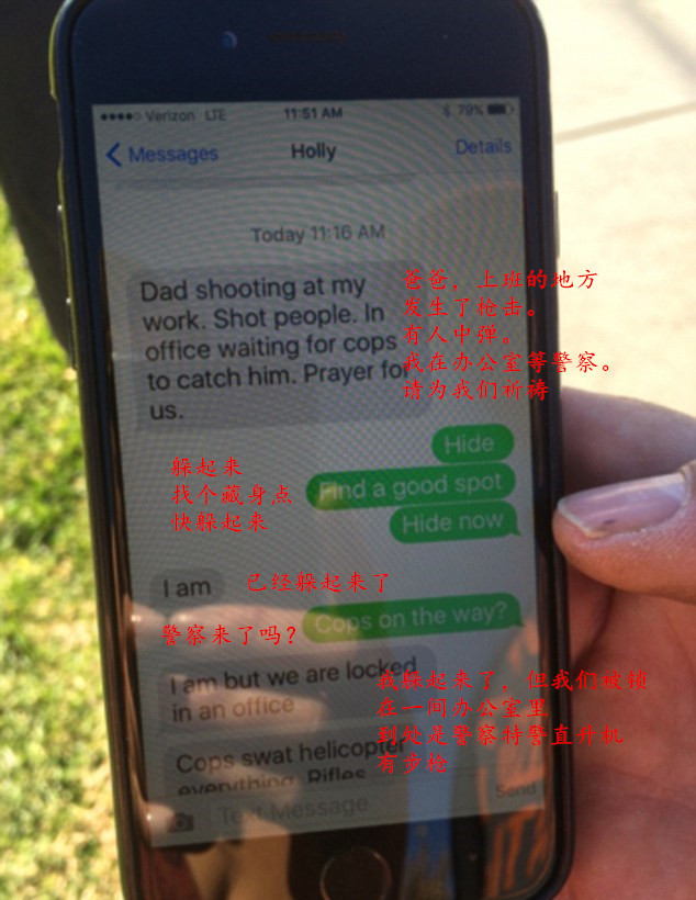 一位名叫霍利(Holly)的工作人员给她的父亲发短信称,“爸爸,我工作的地方发生了枪击,办公室里有人中弹。我现在等着警察来抓人,请为我们祈祷。”她的父亲则连续发短信回复道:“躲起来”,“找个藏身点”,“快躲起来”,仿佛隔着屏幕也能感受到父亲的心急如焚。