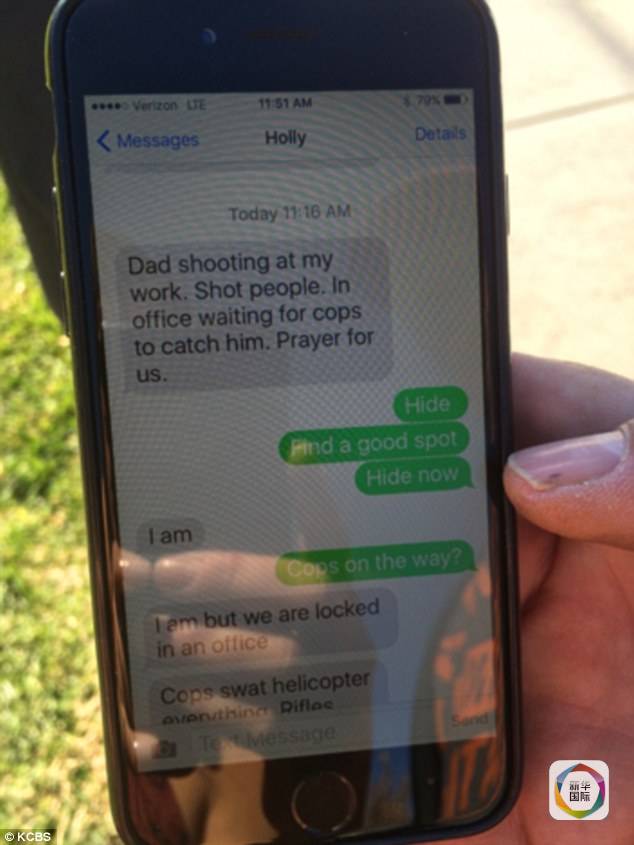 另一名康复中心员工霍利给父亲发短信说:“爸爸,我上班的地方发生枪击。有人被打中了。我们正在办公室里等待警察抓住嫌犯。为我们祈祷吧。”她的父亲回复说:“藏起来,找个安全的地方藏起来,现在!”