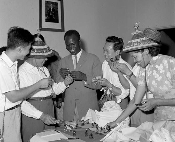 中非人民友好协会代表团在1961年2月24日到6月19日的四个月中,访问了几内亚、马里、加纳、尼日尔等八个西非国家。图为非洲朋友向代表团赠送礼品。(新华社记者孟宪全摄)