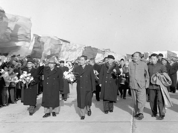 1964年3月15日,国务院总理周恩来结束了对非洲10个国家、阿尔巴尼亚和亚洲3个国家的访问之后,乘专机回京。党和国家领导人毛泽东、刘少奇、邓小平等以及首都各界群众五千多人前往机场热烈欢迎。(新华社记者刘庆瑞摄)
