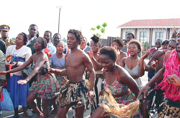 1996年5月22日,津巴布韦首都哈拉雷群众载歌载舞,欢送中国国家主席江泽民。1996年5月8日至22日,时任中国国家主席江泽民对非洲六国进行了友好访问。(新华社记者王新庆摄)