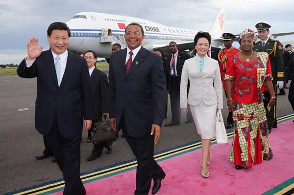 图为2013年3月24日,国家主席习近平乘专机抵达达累斯萨拉姆尼雷尔国际机场,开始对坦桑尼亚进行国事访问。坦桑尼亚总统基奎特和夫人到机场迎接习近平和夫人彭丽媛。(新华社记者 兰红光摄)