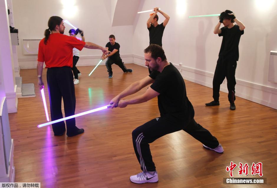 12月4日消息,法国巴黎,《星球大战7:原力觉醒》将于本月全球发布,同时光剑战斗也流行起来,于是三名《星球大战》粉丝合开了一家"Sport Saber League"学院,《星战》爱好者们可以练习光剑战斗,进行比赛。图为练习使用光剑的爱好者。